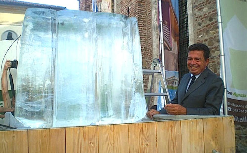 Il sindaco Cimatti vicino al cubo di ghiaccio appena estratto dall'involucro isolante (foto Alessandro Tich)
