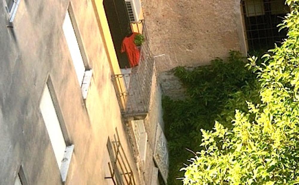 Sotto il balcone, appoggiata sull'erba incolta, la lapide dell'ex Piazzetta Ragazzi del '99 (foto Alessandro Tich)