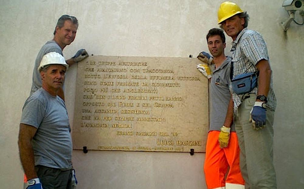 Alle 14 di questo pomeriggio una squadra di dipendenti dell'Ufficio Tecnico e del Magazzino Comunale, dopo aver predisposto l'intervento in mattinata, ha provveduto alla collocazione del manufatto - lucidato a nuovo per l'occasione - che riporta le frasi dedicate ai giovanissimi combattenti spediti al fronte contro gli austriaci dal corrispondente di guerra, e grande giornalista, Luigi Barzini.