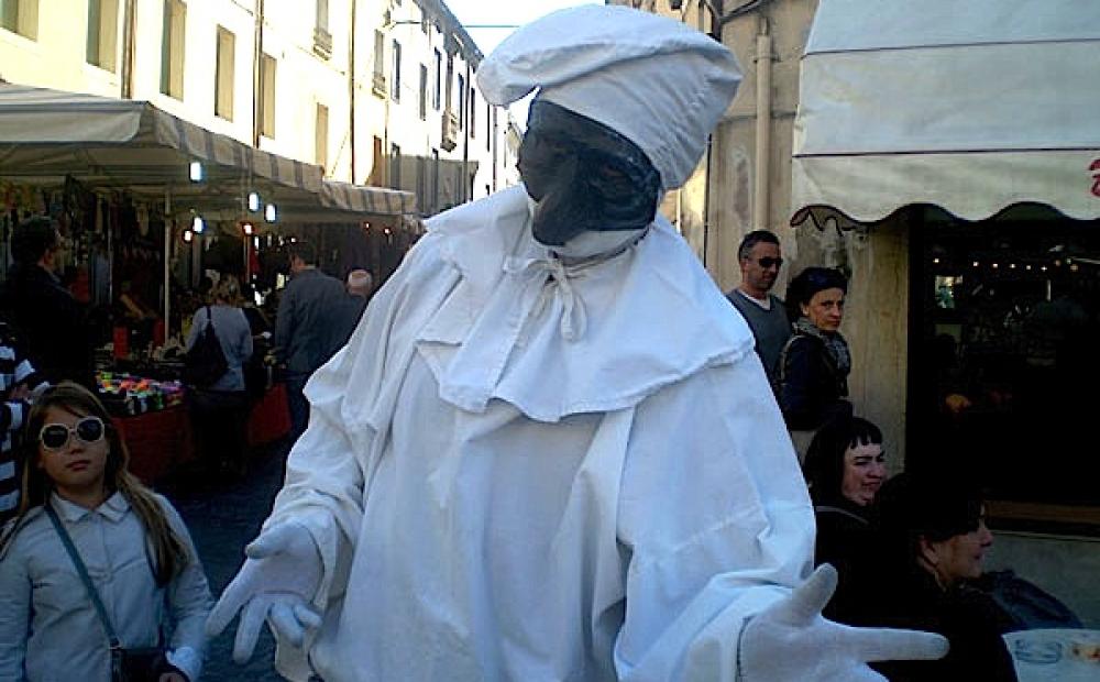 Il bigliettino lo riceviamo da Pulcinella in persona, fermo come una statua all'angolo tra via Roma e Piazza Libertà, nel cuore della Fiera Franca di Bassano del Grappa.