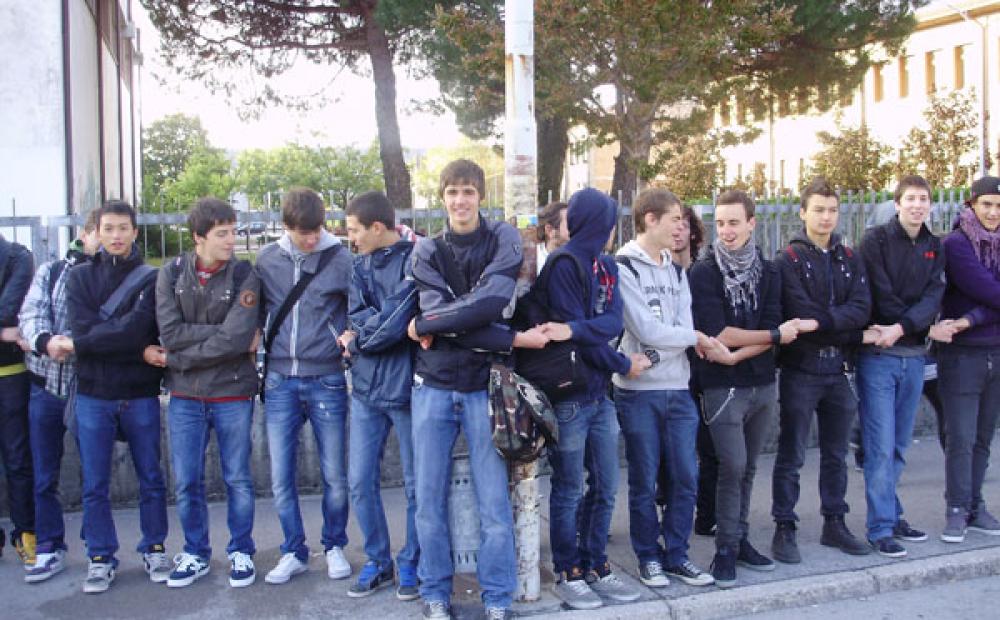 Il flash mob di protesta prende la forma di un grande cerchio, in cui gli studenti si uniscono con le braccia incrociate come a formare delle manette.