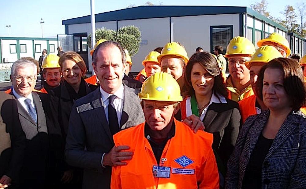 Il primo pensiero del presidente del Veneto Luca Zaia - appena arrivato al Campo Base della SPV di Sacro Cuore di Romano d'Ezzelino per la posa della prima pietra della Superstrada Pedemontana Veneta - è per i tecnici e gli operai che costruiranno l'infrastruttura: un gruppo di lavoratori presente all'ingresso della cerimonia, tuta arancione e casco giallo, è il primo a ricevere il saluto del governatore e a posare per una foto ricordo.
