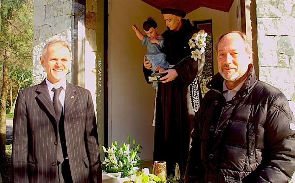 Sergio Dussin e Nazario Campana, figlio di Filomena ("Mena") Buraschi, davanti al capitello inaugurato con la statua di Sant'Antonio
