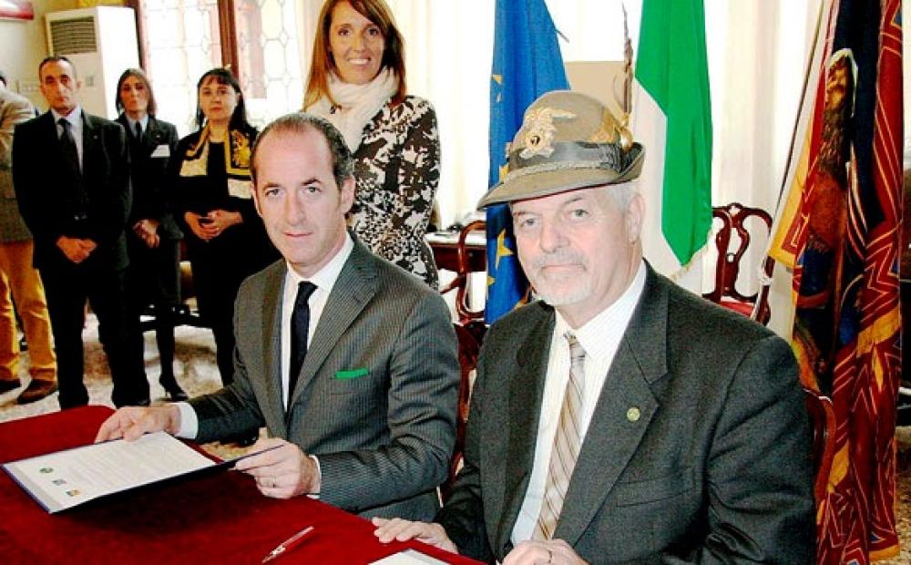 Davanti a lei, a Palazzo Balbi a Venezia, il presidente della Regione Luca Zaia e il vicepresidente vicario dell'ANA Sebastiano Favero (socio della sezione ANA Montegrappa di Bassano), intenti a firmare il protocollo d'intesa tra la Regione Veneto, l'Associazione Nazionale Alpini e l'Ufficio Scolastico Regionale per il lancio di un progetto di promozione della conoscenza dell'ambiente e della cultura alpina nelle scuole del Veneto.