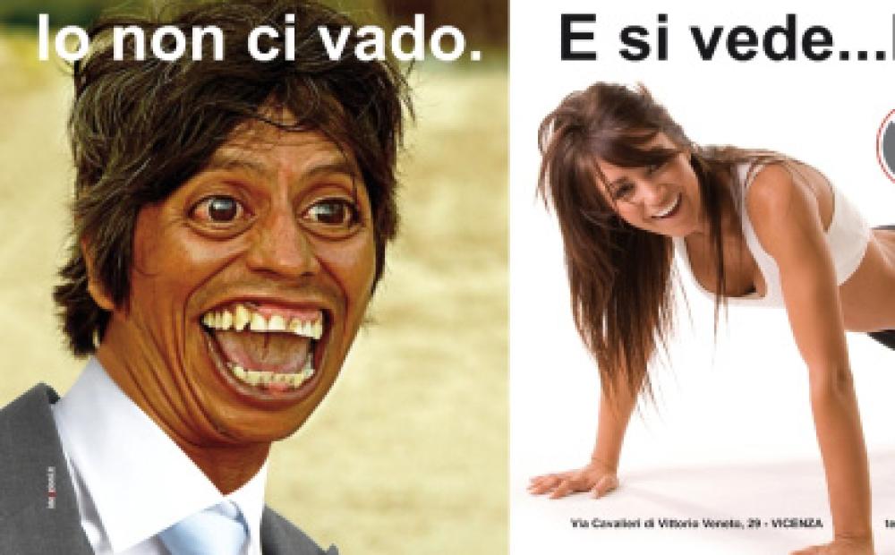 E' bufera, sulla stampa e sulla rete, per l'immagine pubblicitaria di un noto centro sportivo di Vicenza: una bella ragazza che si allena e un uomo bruttissimo, anzi deforme, perché non va in palestra...