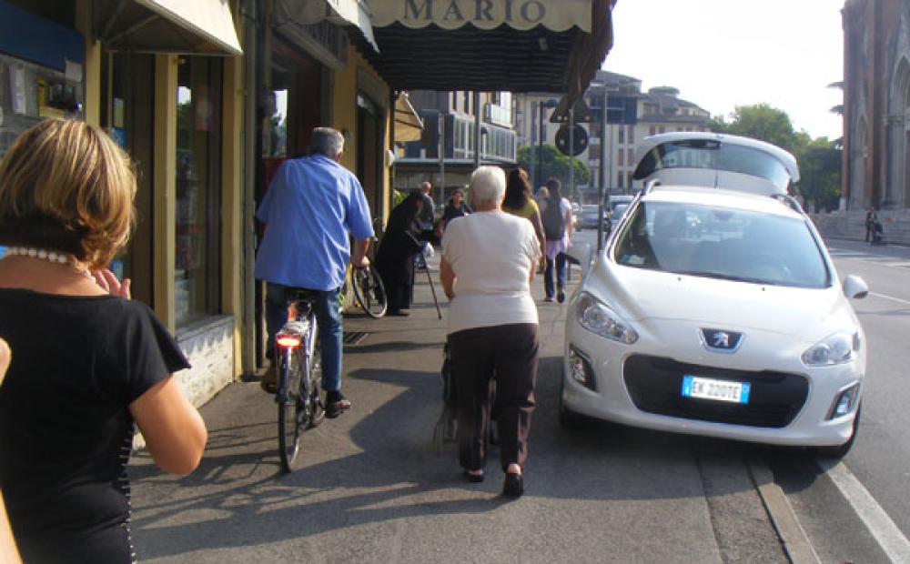 Fin qui nulla di strano, se non fosse per un particolare che rende quel marciapiede particolarmente promiscuo, e in quanto tale non propriamente utilizzato secondo le regole del Codice della Strada, trasformato - in questo punto della città - in un trascurabile optional. Perché quel tratto di percorso pedonale è un classico esempio di pista ciclabile alla bassanese: dove un'impunita e ripetuta sequenza di ciclisti diretti al centro si mescolano tranquillamente ai pedoni, senza scendere dalla bicicletta.