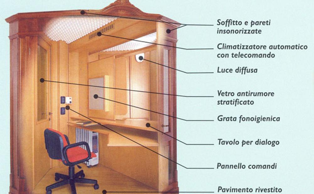 I confessionali hanno “pareti perimetrali a sandwich, con inserimento di materiale fonoassorbente ecologico per garantire un ottimo isolamento acustico”. La canalizzazione nel soffitto favorisce inoltre “una perfetta ventilazione”.