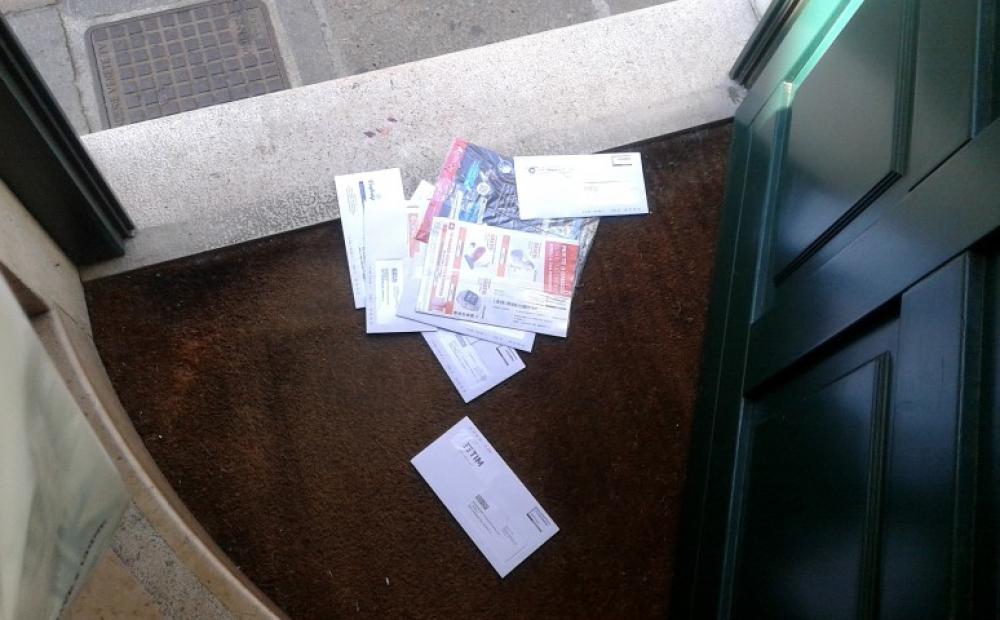 E questo per evitare che le suole delle mie scarpe finissero sopra quello che era letteralmente sparso, in bella profusione, sullo zerbino di entrata: un cumulo di posta indirizzata ai vari destinatari dell'edificio. Bollette, comunicazioni bancarie, inviti, materiale promozionale: di tutto e di più.