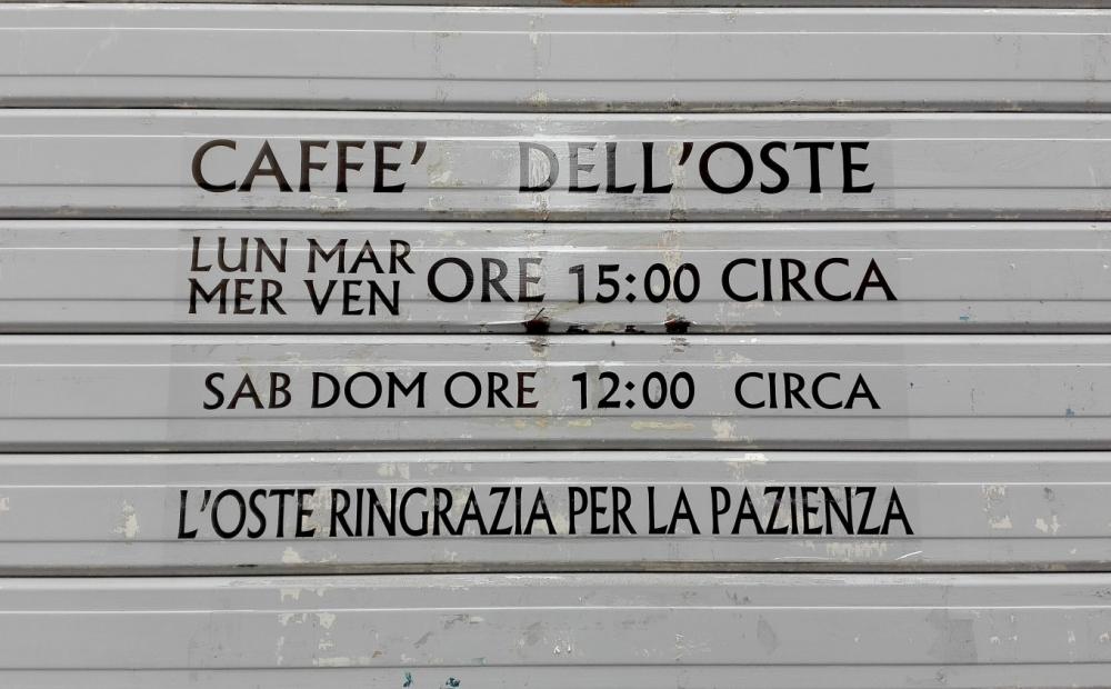 Sabato mattina, mentre scendevo per via Gamba a Bassano, ho notato per caso la bellissima scritta sulla saracinesca abbassata del “Caffè dell'oste”, locale pubblico che si trova dirimpetto al “Caffè dei libri”. Si tratta dell'avviso per il pubblico sugli orari di apertura del bar che, come da foto pubblicata sopra, recita così: “Caffè dell'oste. Lun mar mer ven ore 15:00 circa. Sab dom ore 12:00 circa.” Messaggio conclusivo: “L'oste ringrazia per la pazienza”. Semplicemente stupendo. Una comunicazione nella quale la parola “circa”, peraltro, compare in netta evidenza.