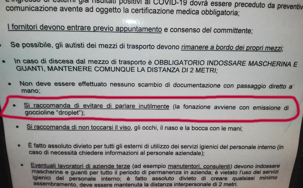 Sono loro che devono evitare di parlare inutilmente. La prescrizione si aggiunge alle altre ferree norme a cui i medesimi devono sottostare: come l'obbligo di indossare mascherina e guanti e di mantenere comunque la distanza interpersonale di 2 metri, più diverse altre regole restrittive come il divieto assoluto di utilizzo dei servizi igienici del personale interno o il divieto di scambi di documentazione con passaggio diretto a mano. E nonostante la mascherina davanti a bocca e naso e la distanza di sicurezza, tutti gli “esterni” - fornitori e affini - devono anche ridurre all'essenziale le parole.