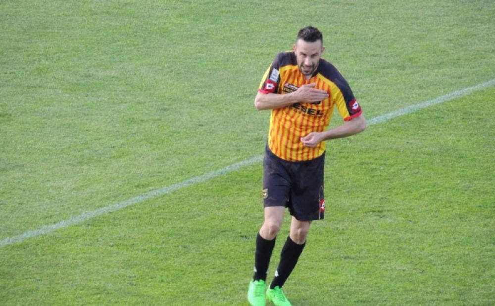 Stefano Pietribiasi accompagna batte il pugno sul cuore dopo aver siglato il gol partita (foto Claudia Casarotto)