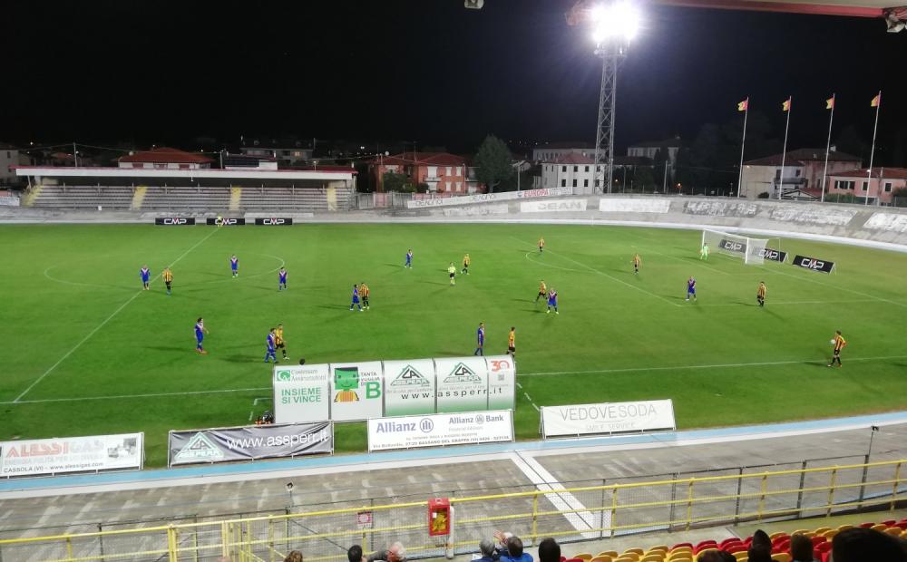 Mister Maino mette in campo un undici rivoluzionato rispetto a domenica, un undici di partenza che vede i trequartisti Cacciotti e Mason ai lati di Garbuio. I giallorossi danno l'illusione di un'ottima partenza salvo lasciare il pallino del gioco ad un Valbrenta volitivo ed in partita. Gli ospiti sono ben orchestrati da Manuel Parise ex promessa bassanese, frenato da troppi infortuni. I padroni di casa danno qualche timido segnale di risveglio sul finire di tempo ed impattano meglio l'inizio della ripresa. È Cacciotti a sfondare a sinistra senza trovare compagni pronti alla deviazione. Quantomeno adesso si gioca nella metà campo degli arancioblù. L'ingresso di Calgaro aumenta il peso offensivo e grazie ad una sua intuizione il Bassano sfiora il vantaggio. Paradossalmente sono però gli ospiti a passare nel loro momento peggiore, al quarto d'ora. Nel frattempo la Marosticense continua a condurre per 1 a 0 a Rosà, salvo subire la rimonta dei padroni di casa. Con i rossoneri di Glerean inchiodati da un mancato successo per il FCB si spalancherebbero le porte del passaggio del turno a patto di superare proprio il Valbrenta. Il risultato invece sorride ai bluarancio. Bassano eliminato dalla Coppa Veneto e con diverse scorie da smaltire. Domenica stesso posto ore 15:30 andrà in scena la pronta rivincita in campionato.
