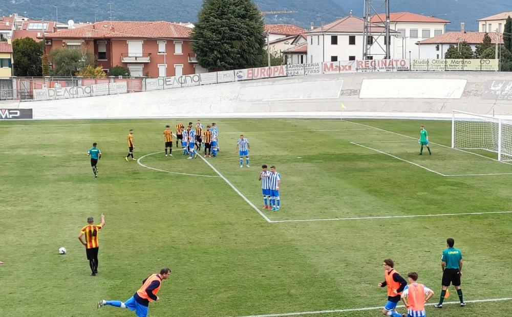Mister Glerean, complici le assenze di giocatori determinanti (Lukanovic, Sandrini, Salata che è appena stato recuperato, Marchiori e Gashi) e l’infortunio di Minozzo nel riscaldamento decide di proporre una squadra con un difensore in più e un attaccante in meno. Ma il brutto primo tempo non può confortarlo anche se non è una questione di moduli o di tattica. Il Bassano evidenzia vari ordini e gradi di problemi. Innanzitutto il livello di autostima è desolatamente basso. La mancanza di risultati incide molto e la difficoltà di pervenire ai tre punti per forza di cose diventa un tarlo continuo e fastidioso. In secondo luogo i giallorossi subiscono troppe reti e fanno una fatica bestiale ad andare in gol con azioni manovrate, carenza spesso mascherata con reti su palla inattiva. Causa ed effetto non sono spesso così definiti e il tutto si traduce in un gioco privo della dovuta serenità nel quale si cerca quasi esclusivamente di risolvere individualmente  o ricorrendo a palle lunghe nella speranza che le punte in qualche modo se la cavino. Se il primo tempo è inguardabile, il secondo fa sperare in qualcosa di meglio. Il BV mette in campo tanto orgoglio, tanta voglia di andare oltre agli attuali limiti tecnici. Sono gli episodi, come spesso capita, a determinare il risultato. Al 20’ Zuin dal dischetto del rigore potrebbe portare avanti i suoi con un tiro che viene acciuffato in qualche modo dal portiere ospite. Pochi minuti dopo i vicentini trovano la rete su palla inattiva. La reazione c’è anche se è tanto veemente quanto confusionaria, specie con Chia che fa vedere lampi molto interessanti ma sbaglia la scelta di andando ad imbottigliarsi centralmente invece di allargare le maglie avversarie. L'arbitro interviene troppo cosicché la gara non prende mai ritmo e alla fine i giallorossi devono chinare la testa di fronte alla prima sconfitta in campionato.