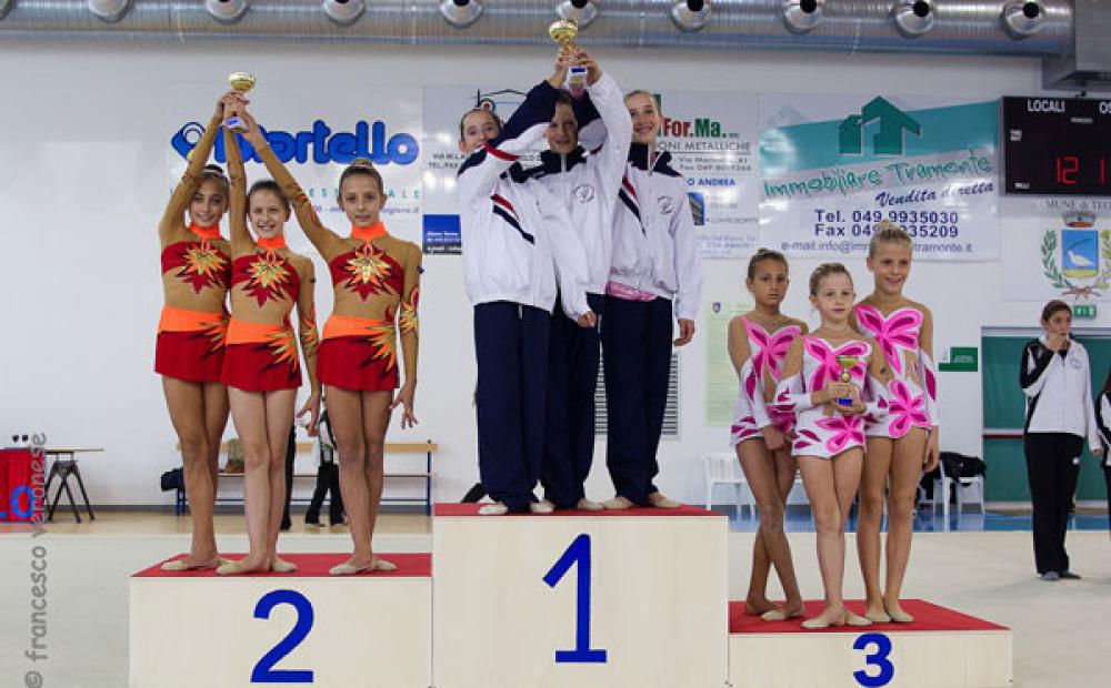 Facevano il loro primo esordio in una gara di alto livello le allieve prima fascia Emma Pallaro, Teresa Mariotto e Irene Andriollo che hanno conquistato rispettivamente il sesto, settimo e ottavo posto nel trofeo Gpt ed il terzo posto nel concorso d’insieme eseguendo in pedana un collettivo al cerchio e al corpo libero.