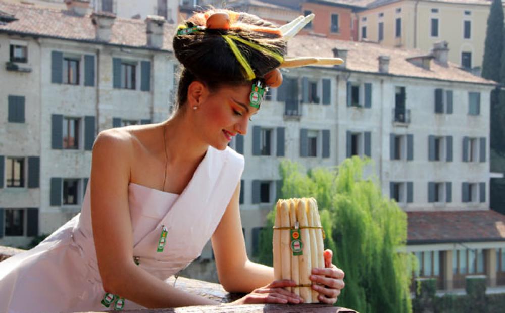 Per l'evento sul Ponte, Ilario Baggio ha ideato un'acconciatura “rinascimentale” sul tema dei sparasi e ovi, con l'etichetta verde del Consorzio dell'Asparago Bianco di Bassano D.O.P. inserita a mo' di spilla sui capelli e sul vestito, ovviamente bianco. Per l'anno prossimo, sfidiamo il buon Ilario a inventarsi una creazione ancora più ardua: l'acconciatura al risotto.