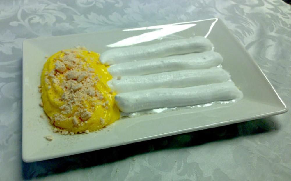 Il gelato “Ovi e Sparasi” si può già degustare alla gelateria “Crema Gelato” in coppetta sotto forma di classica pallina, con una crema di tuorlo appositamente creata per l’occasione e, in esclusiva, al ristorante “Alla Corte” dove lo chef Federico ha scomposto l’uovo usando l’albume per creare una meringa con poco zucchero che viene sbriciolata sopra al tuorlo (salato) che, assieme ad un’acqua di asparago, viene “sifonato” sulle punte degli asparagi fatti di gelato all’asparago.