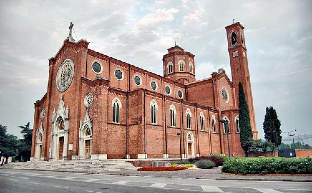 L'esterno è in stile gotico-veneziano con tracce di romanico; la mole massiccia si eleva sopra otto scalini in pietra di Pove; è sormontata da un severo triburio ottagonale, snellito da due agili campanili alti 60 metri. A croce latina, l'interno misura 75 m. di lunghezza, è a tre navate divise da 10 colonne di marmo. All'interno sono sepolti circa 6.000 soldati, di cui 236 decorati. L'8 febbraio 1945 un grappolo di bombe cadde davanti alla facciata, scoperchiando molti loculi, di cui sono rimaste fotografie agghiaccianti.