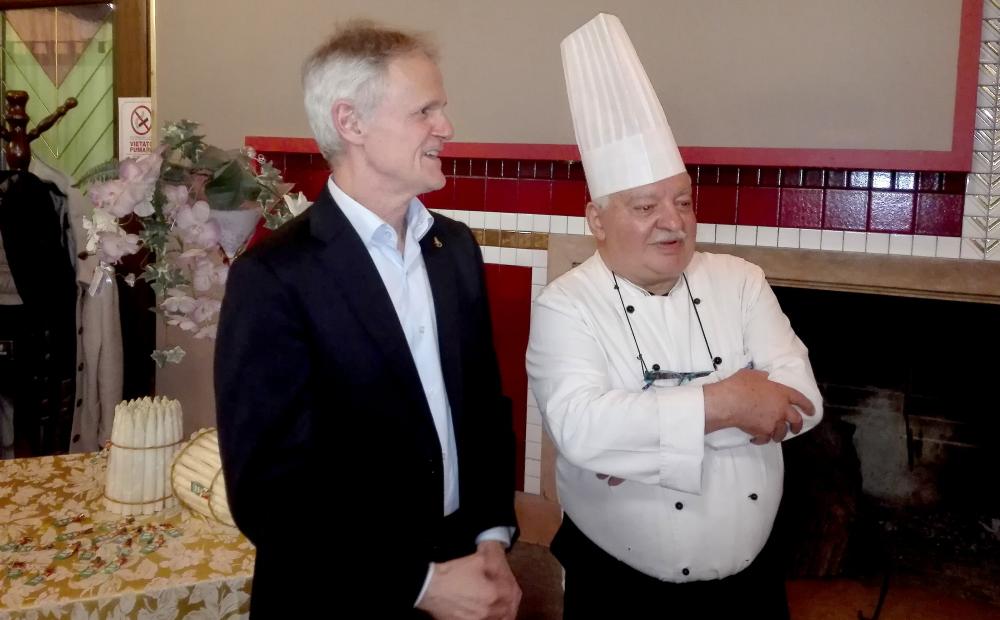 Al Ristorante Al Pioppeto di Romano d'Ezzelino cena di gala per la rassegna “Asparagi & Vespaiolo”. Chef ospite, accanto al padrone di casa Sergio Dussin, Guerrino Maculan