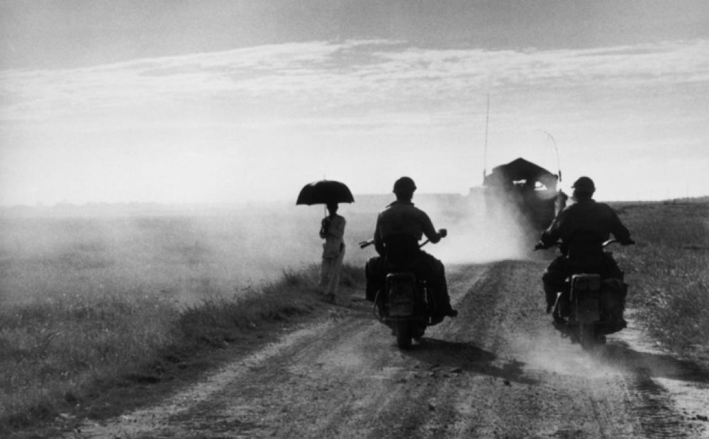 Motorcyclists and woman walking on the road from Nam Dinh to Thai Binh, Vietnam, May 25, 1954 © Robert Capa © International Center of Photography/Magnum Photos