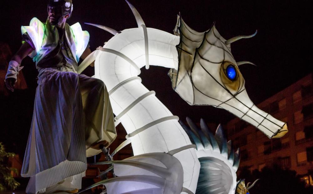 Una parata che è molto più di una semplice invasione spettacolare delle vie del centro: è un suggestivo corteo luminoso che avanza nella notte, accompagnato dai ritmi dei tamburi Taiko e da suoni elettronici. È una Via Lattea di meduse, stelle marine, guidate da un maestoso Ippocampo che porta con orgoglio il carro di Oceano, sovrano dei mari, attorniato da pesci smisurati, manovrati da audaci burattinai. Come un’onda, le creature del mare sommergono la città e ne disegnano un inedito cielo, specchio della sua vita più profonda, in un rovesciamento affascinante tra cielo e mare.