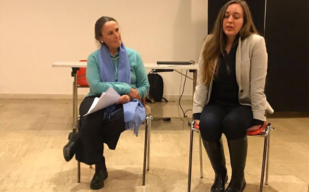 La moderatrice dell'incontro Francine Reuter intervista Cristina Guarda (Europa Verde)