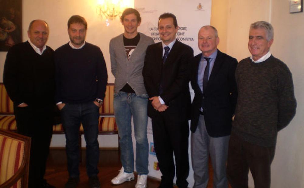 Gian Antonio Bertoncello dei "Fedelissimi", il DG del Bassano Virtus Stefano Braghin, Filippo Pozzato, l'assessore Alessandro Fabris, l'avv. Nereo Merlo e Nico Rigoni della "Città della Speranza"