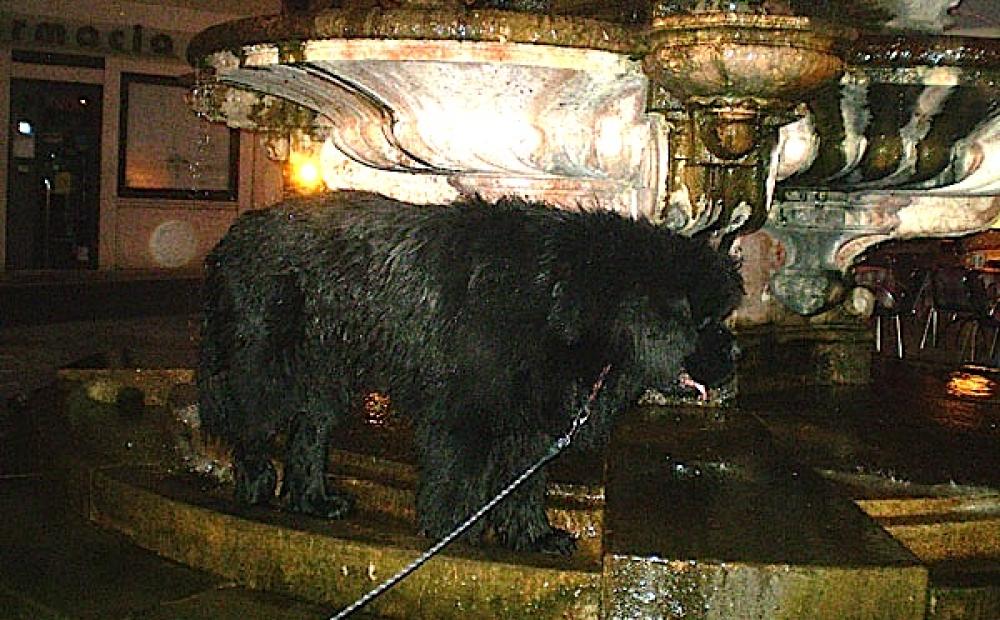 E capita spesso, come è capitato anche a noi, di vederlo pacificamente accucciato, con tutta la sua mole, sulla fontana di Piazza Garibaldi a Bassano del Grappa: in assoluto, il suo posto preferito. Perché sotto l'acqua zampillante della fontana la frescura è assicurata. Un piacere da assaporare in totale beatitudine.